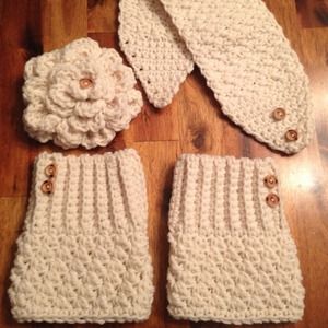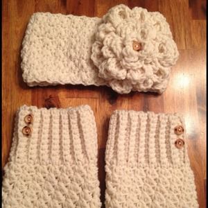 Adjustable Earwarmer with large removable flower and matching boot cuffs. I personally make these so can be done in additional colors.