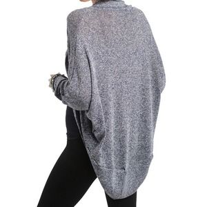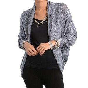 Speckled long sleeve cardigan features an open front design with curved hemline.