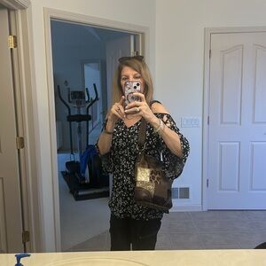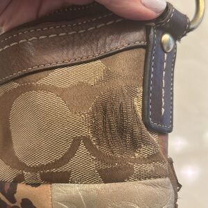 Coach purse for sale. Overall fair condition, due to a few areas worn a little thin. Look for these in the photos. Price reflects those areas. Medium size. Zipper in it. Adjustable strap. Brown shades in it. It still is Stunning!!It has a lot of life left to it.