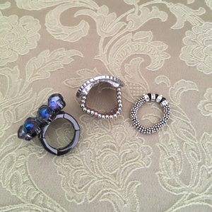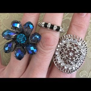 Three unique rings on elastics. The blue flower is Chicos Brand. The other two are Silvertone one large with Crystal embellishments and one small with black beads and Crystal. Can be worn by sizes seven up to 9.5. $10 items are firm unless bundled. By five $10 items and pay only $30. Thank you. ☘️☘️☘️