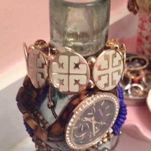 Gold bracelet with white detailing // Elastic band makes piece a one size fits all // Perfect to match with any watch // Perfect condition