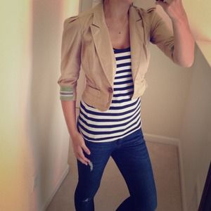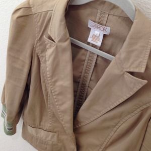 Adorable cropped khaki blazer with fun sporty detailing in trim