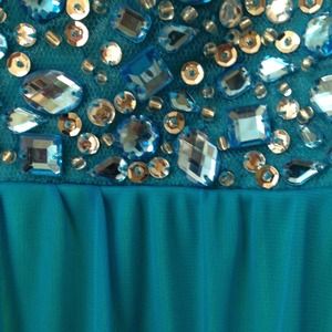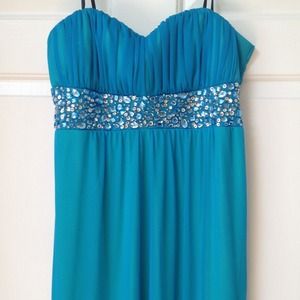 Elegant and chic, this strapless dress features a flattering sweetheart neckline and a pleated bust with comfortable padding. Rhinestones sparkle at the empire waist, and the gathered skirt flows out in a luxurious wave of chiffon. With a contrast knit lining, the sheer chiffon creates a dimensional, multifaceted color explosion. Sweetheart neckline; non-slip silicone strip. Strapless. Pleated and padded bust. Banded empire waist. Gathered skirt. Rhinestone detail. Chiffon overlay. Back zipper.