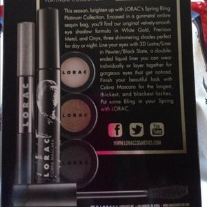 LORAC's Spring Bling Platinum Collection comes encased in a gunmetal ombré sequin bag and consists of three eye shadows (White Gold/Precious Metal/Onyx); 3D double-ended liquid Luster Liner in Pewter/Black Slate; and Cobra Mascara! Put some bling in your nights with LORAC Spring Bling collection! ***Brand New in Box--Never Used***