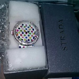 Gorgeous brand new in box STRADA brand Watch with austrian crystals and polka dots! Japanese movement. This watch is high quality and a rare find design coated stainless steel flexible stretch band. My wrist is 7.5 inches and it fits snugly. Best fit on 6.5-7.25" wrist. Ready for wear or gift giving!