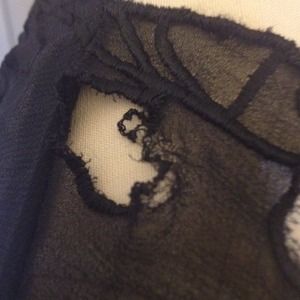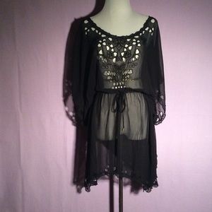 This a great swim suit cover up. It has cut out detail in the front and more patterns on the back. Says size small but could fit medium or large too. There is a small spot on the right shoulder where threads unravelled a little. Easy fix. Never worn.