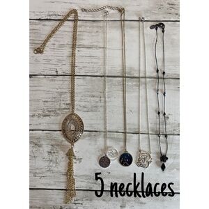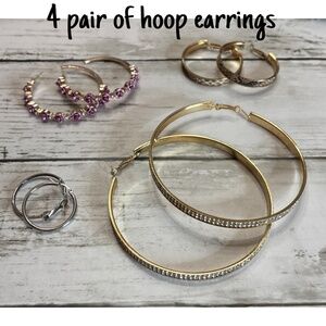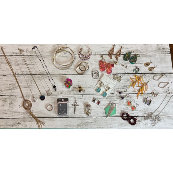 53 piece costume jewelry lot. Some have been used, some have not. Includes 5 necklaces, 4 pair of hoop earrings, 17 pair of dangle earrings plus 1 single, 1 rose gold thumb ring, Nose piercings, 2 lapel pins and a bejeweled bumble bee.