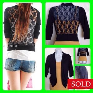 In perfect condition lace back cardigan in navy blue. Sleeves: 16 inches. Nape to bottom: 20 inches. No holes or rips in this cardigan! ๐ size:xs-sm