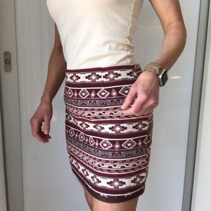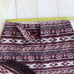 Rich red, burgundy, ivory, and gray tribal print with faux leather trim.