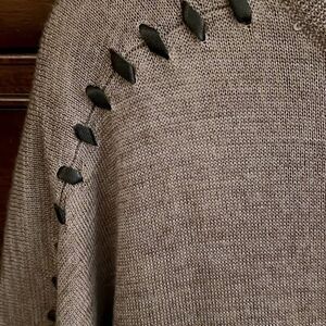 5/48 by Saks Fifth Avenue brownish/ gray wool blend sweater w black Faux leather fringe detail on the high low hem. Additionally there is whip stitching detail along the shoulders. NWOT XS