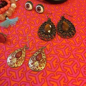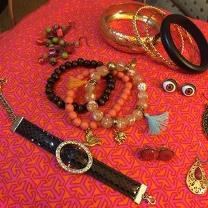 These colors remind me of a beautiful sunset. This bundle includes: two sets of tear drop shape earrings with stones in the center also a pair of multi stone Sandler. Two sets of studs, one set is eyes in a brown color and a orange color circle stone. Two sets of bracelets, one set is a stretchy round stone (3) with charms the other is a set of 4 with 3 metal and one wood. Last bracket is a faux leather with silver bling buckle. Great bundle. Please ask any questions you have. Offers considered