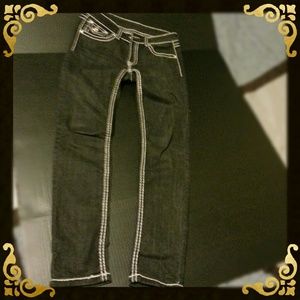 This is one great pair of jeans! Black with embellishments, and stitching. In great condition :-) Says size 9. Measured across when laid flat 16" 30"Inseam