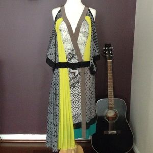 Brand new with tags BCBG Magda Dress. This gorgeous dress has accordion pleats that fall to the side of the skirt, creating a sophisticated asymmetry on this chiffon wrap dress. Prints mixed with solid panels make a vibrant statement. Buttons fasten at the waist and shoulders peak out from flirtatious cutouts on the elbow length kimono sleeves. Skirt is lined, semi sheer bodice. An absolute jewel to have in your closet! Size is XS but flowy material allows dress to fit size S-med as well.