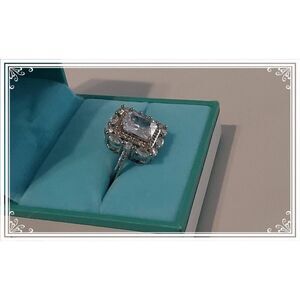 This stunner features a 4 carat center emerald cut simulated diamond gemstone and is surrounded by an additional 1.5 carats of round and marquise gemstones in a shadowbox design. It is set in sterling silver with a layer of 18k white gold and is size 8. The total carat weight in the ring is 5.5 carats.