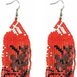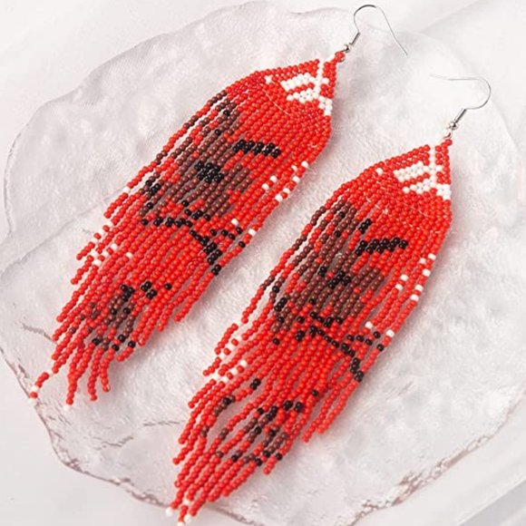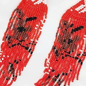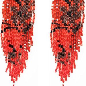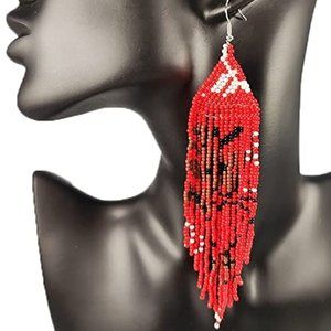 New, approx 5.5" handcrafted cherry flower dangle earrings in red , white , and black