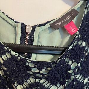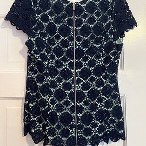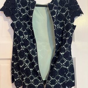 DESCRIPTION: Stunning and like new crochet, navy lace top. Mint color underlay for contrast. Posterior zipper with protective plastic still intact.