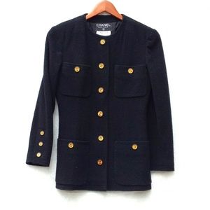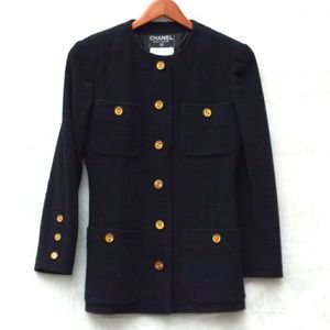 Jacket and Skirt are lined in black silk. Chanel Signature Gold buttons (Chanel Stamped on back of each button) 2 fully-lined front pockets on jacket. 100% Black Wool Boucle - Lined in 100% Black Silk. This is a classic and sophisticated suit in MINT condition.