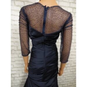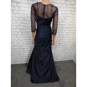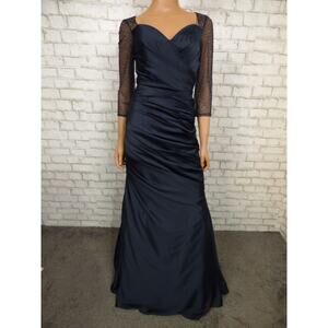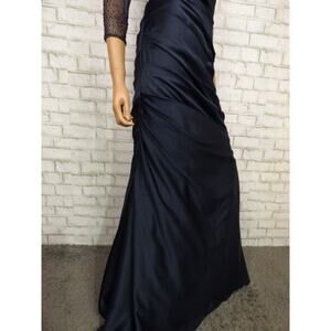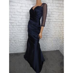 $558 La Femme 30138 Navy Blue Satin Ruched Trumpet Illusion Gown 12 NEW
