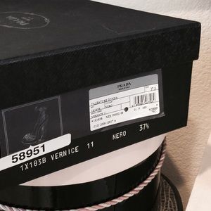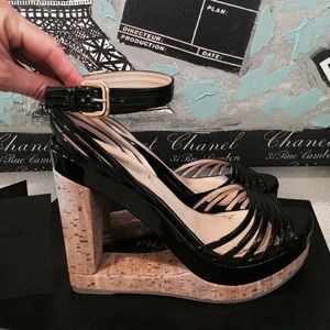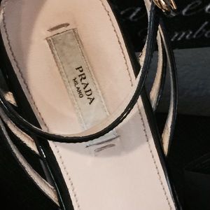 Authentic Prada Cork Trendy Wedge Sandals. Seldom worn. Prairie condition. Black Patent Size 37.5. They come with there original box. Love the ankle wrap strap.
