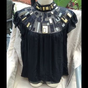 This top is feminine yet edgy. Silkie black lined fabric with a mesh bodice and mock turtle neck. Add the geometric embroidery in shades of precious metals! OMG ๐ hubba hubba
