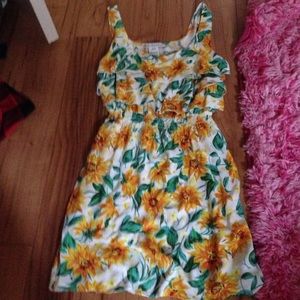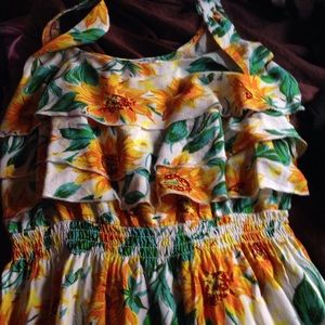 Has really soft and light material with a super cute sunflower design! Has a flowy layered top with thin straps. A perfect summer dress!!