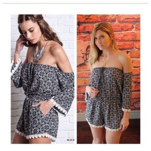 Black printed off the shoulder lace trim romper