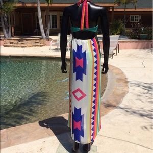 Dress up your beach wardrobe with this vibrant halter beach cover up. Features an all over geometric tribal print in the brightest of hues. Finished with a tie front detail and elastic middle. Can be crossed in front for a different look. Mannequin is 5'9", wearing the S/M. Pair this with a floppy hat and sandals for a fun look. 100% polyester. Very well made, and super comfortable. Available in S/M and M/L