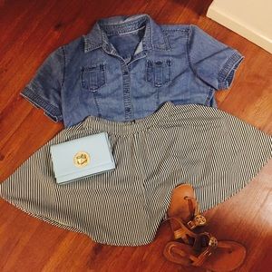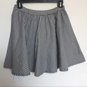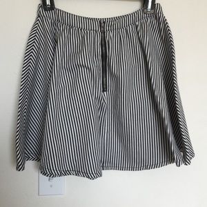 Striped black and white shirt. Short. Adjustable with zipper. Runs true to size. 16 ins waist to hem. I love this skirt. Used to always pair with denim shirt. Sadly does not fit me anymore. Price firm.