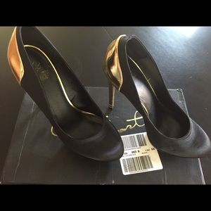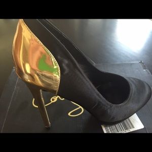 These super high heels are legit! Satin black with high shine gold accents on heel makes these eye catchers for sure! Not to mention a superior glutes and hams workout just while walking in them. Almost 6" from top back of heel down and 4.5 on the inner portion of the heel down. Quite the shoes! Worn only 4 times. Size 9, but fits like an 8.5.