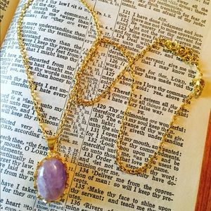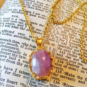 Brand new. Never worn. Faux stone pendant piece. Light pinkish purple stone color. Acrylic type material. Faux gold metal. Clasp closure. Adjustable chain length. Gorgeous necklace!!