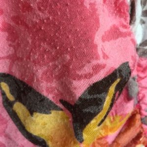 A MUST WITH WHITE! So pretty, Pink Floral Print, soft with stretch and cowl neck. Ruching at sides. Some signs of wear but still in very good condition. Bought at Macy's. Size L but will fit a M.
