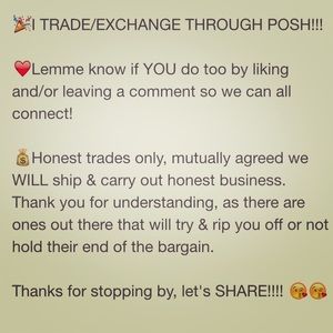 Ladies, share this so MANY can see, the ones that are willing to trade/exchange! I only do it through Poshmark by lowering to $3 (the minimum), that way it's safer...still Posh guarantee, shopping info & tracking, etc. Thanks for stopping by, leave a note! 💌💌