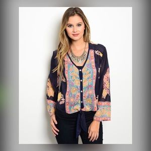 This 100% polyester navy top has a gorgeous pattern on the front and flowers as well. It is a button down with a tie at the hem. So pretty on. Things just right! The small measures L21" B18" W19"