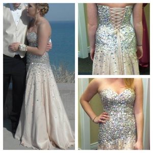 Vanilla colored prom dress only worn once! Its in great condition too with no rips or stains! Also was dry cleaned after it was worn. It has beading all throughout the top and through the waist line. Strait but flowy bottom. Also has a corset back and can be tied tighter or looser depending on size. Its a size 6 but fits between a 2-8 depending how open you would like the corset. Its also on Ⓜ️ercari for $300