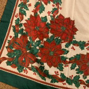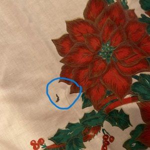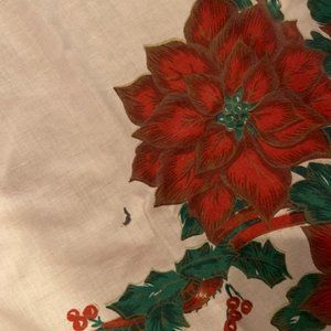 56” x 98” oblong fabric tablecloth with poinsettia print. EUC. Tablecloth is cotton/polyester blend. There are a few spots (see photos).