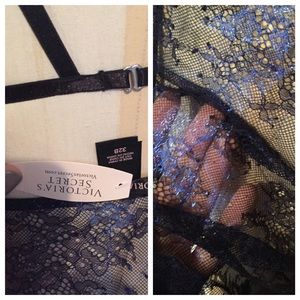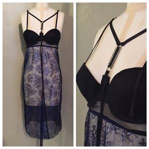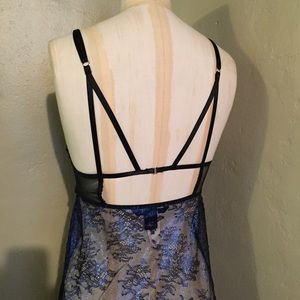 Amazing lingerie gown from VS! Flyaway front and skirt in all over blue foil lace! Bra top is size 32b but would fit 32a/XS as well! Lightly lined bra with single hook and eye in back. Pull on style. Adjustable straps and strappy back! Strappy neckline with chain detail. This is a knockout piece! Rare find! :) the blue foil lace collection was my favorite.