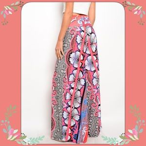 LAST ONE Brand new wide leg palazzo pants. Colorful mixed print, wide legged silhouette and fold over waistband. 92% Polyester; 8% Spandex; L: Approx 45" W: Approx 14" (measurements taken with the medium size); these come in medium and large only and fit true to size. It says they fit true to size but I think they are a little big.