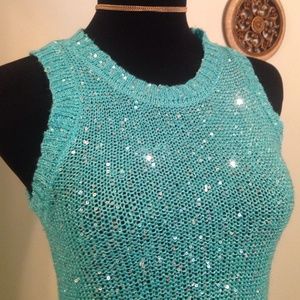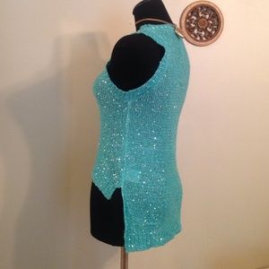 Gorgeous turquoise blue high low sweater sleeveless very classy knit silver sequins sewn into it it is by absolutely creative world wide size small very pretty would look beautiful with a white or or silver Cami underneath or if you like the more risqué luck a nude bra. Perfect for work going out or casual! Thank you for looking and enjoy I ship every 24 hours