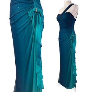Shades of teal Lightweight knit chiffon with sparkles imbedded in the fabric. Lined with a solid teal knit fabric. Teal gown has a ruched bodice, including the one shoulder strap. Skirt portion is ruched with a cascade of ruffles down the left side. Side zipper. Sized 5 Jr, but fits a Misses 4.