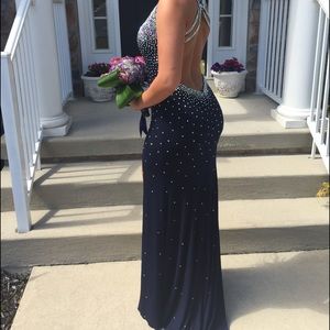 Navy blue with iridescent rhinestones. Slit along the left side of leg. Open back. Price negotiable. Worn once! In great shape nothing wrong with it. Matching shoes can be sold for free along with dress! Size 7 1/2 shoe