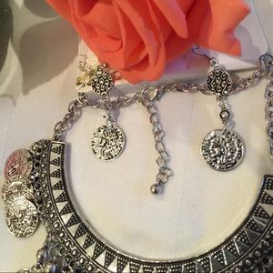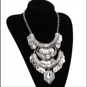 Bohemian tribal bib necklace in silver tone with large crystal bead on the bottom layer & coins on the others. Matching earrings are lightweight & are included. Beautiful set!