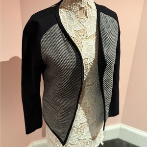 This is such a gorgeous suit jacket, and features leather straps that look like snake skin. Size 12 measurements: bust 40 inches, waist 34 inches, length 25 inches.