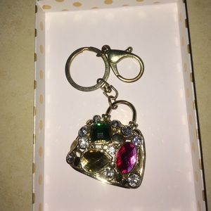 Keychain in the shape of a purse with rhinestones.