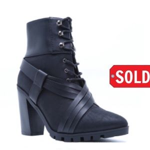 Ultra chic lace up bootie. This shoe features a leatherette upper, pointy toe, lace up tie design through grommets, crisscross brown strappy detail set on a lug sole & stacked heel. Wickedly funky & fresh! BRAND NEW W/ BOX. ALL BLACK, suede & leatherette.