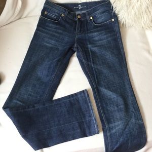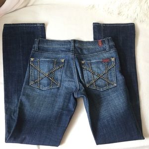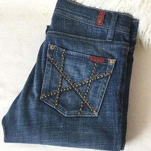 7 for all Mankind Like new dark wash jeans in style Mia. Excellent condition only worn and washed once. Beautiful brass studs adorn the back pockets. A straight cut to a Slight boot cut style with inseam at 31" long and waist at 14" across front and hips at 17 1/4" across front. 8" rise