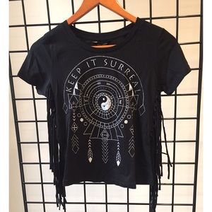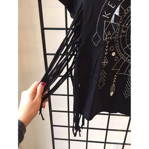 Graphic tee with unique side fringe (both sides). I have 5 in stock. From the UK.