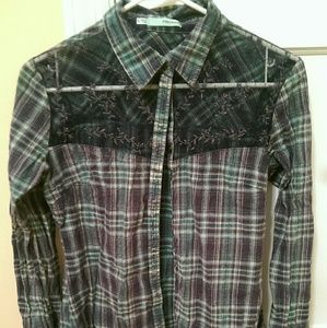 Distressed top perfect for wearing with a skirt and cowboy boots! Lace detail on front