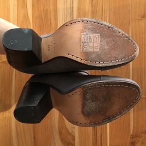 Beautiful booties. Grey leather with brown leather strap and very dark brown/black wooden heel. Worn once or twice. Very little visible wear. A couple tiny little marks that you would never notice unless you're looking for them.