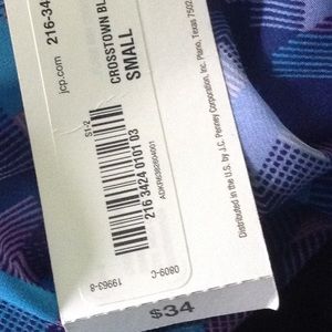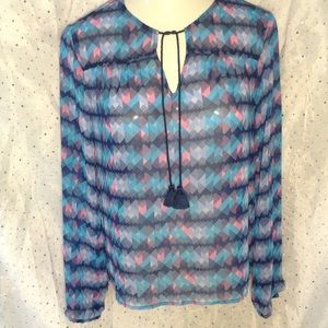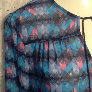 Super cute sheer top with tie detail. Different shades of blue highlighted by pink. 100% polyester, machine wash. You will want a cami or tank underneath.