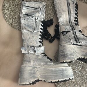 Brand new grey faux suede bakers over the knee boots never worn ... Bottom front platform has silvery grommets and mini spikes .. Inner zipper .. top lip can be folded down or worn up.. Two inch platform heel approx six inches .. Hesitated selling but ive never worn them and hardly wear anything to match the grey .. Tried on only never worn out... No original box